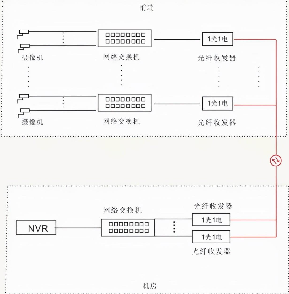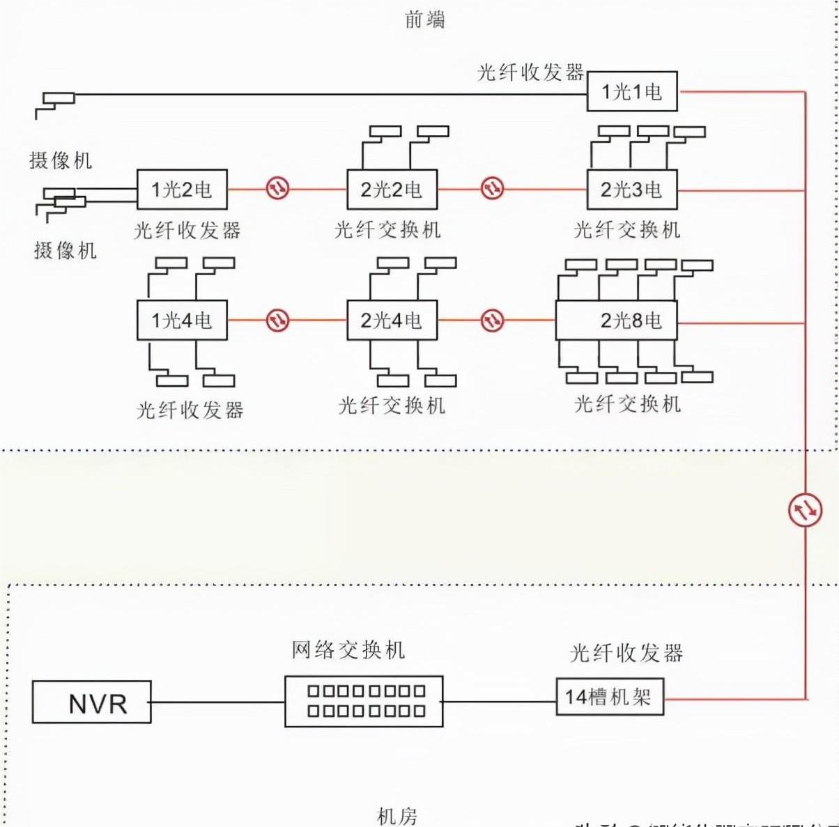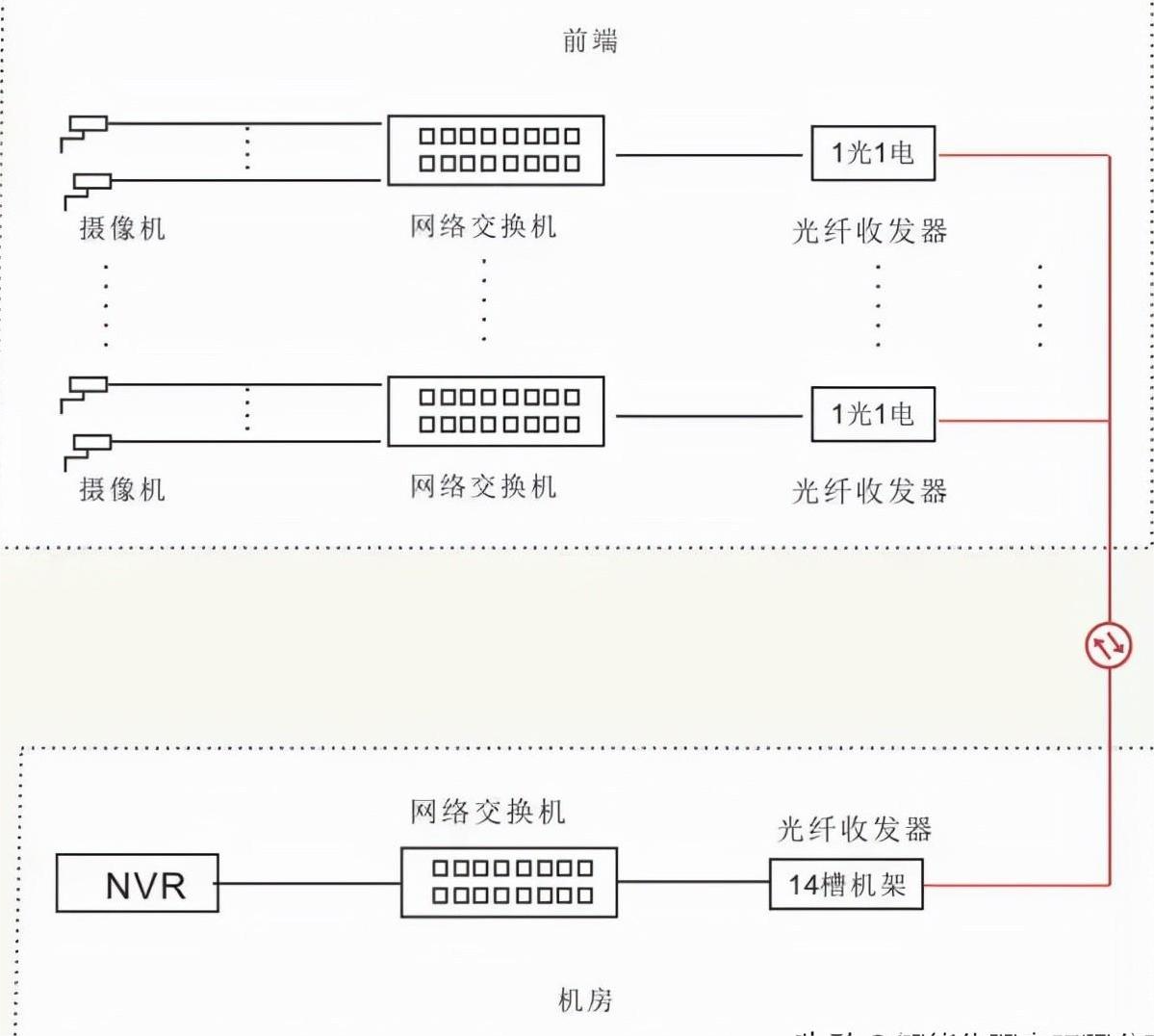 前端級聯型收發器鏈接多個攝像機,通常一芯光纖上可以鏈接十幾個二光多電的收發器,后端用收發器機架集中供電,統一管理。