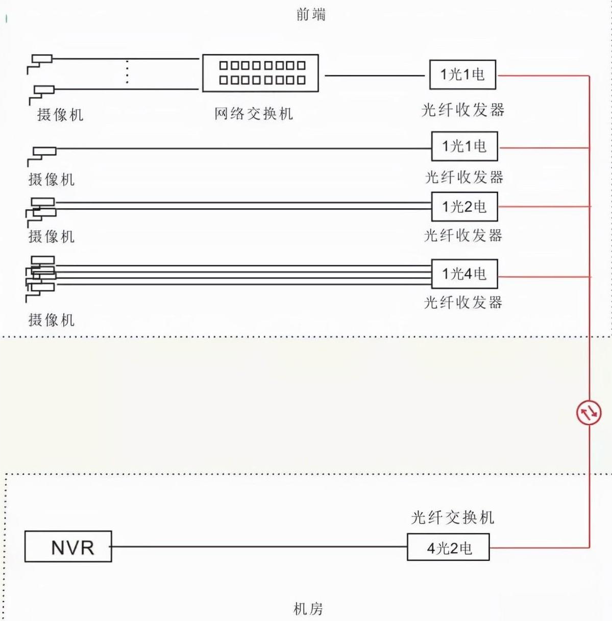 前端用交換機+收發器、1光多電收發器兩種方式混合使用,后端用匯聚型收發器接收。