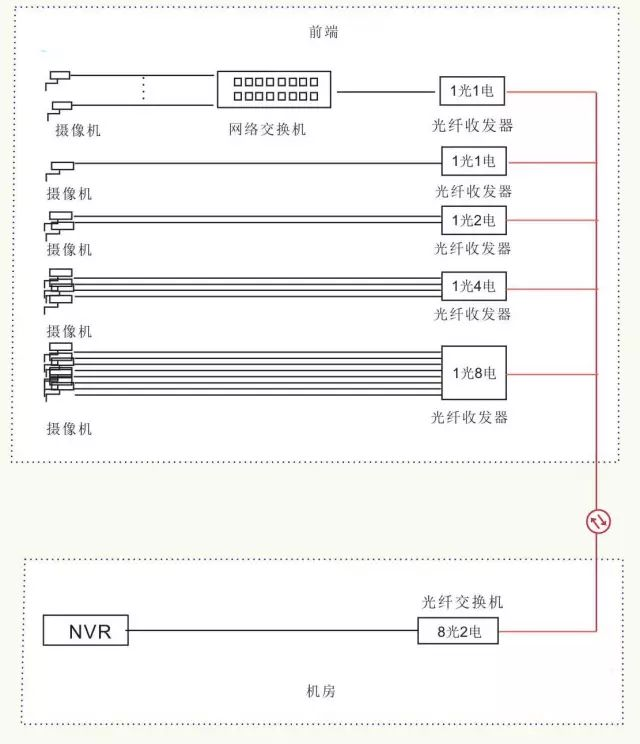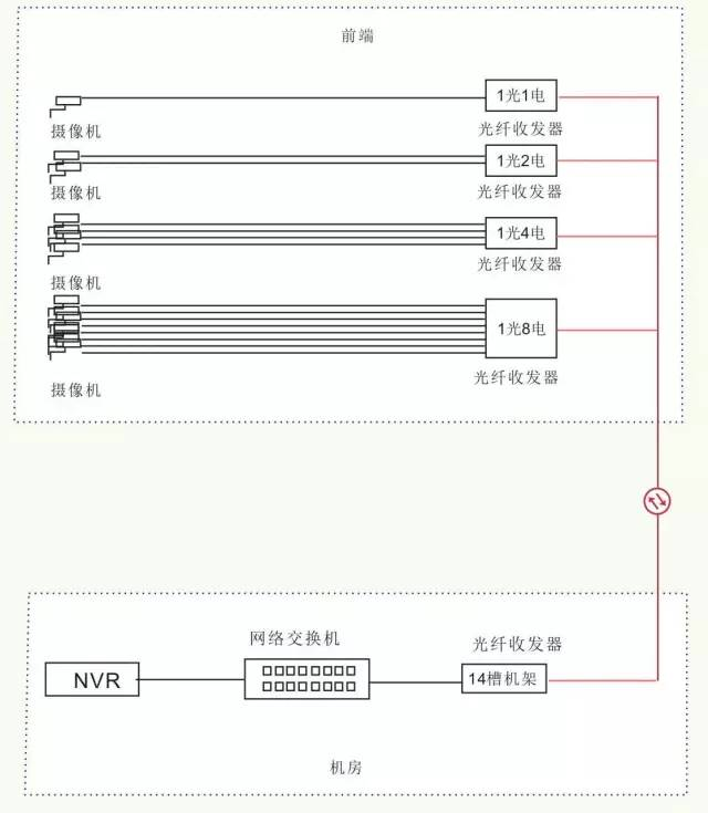 前端直接用1光多電的收發器連接攝像機,前端1光2/4/8電口,后端1光1電的連接方式。少用了一次交換機的中繼。